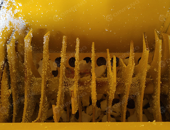 傾斜投料斗一便于投 EPS 物料,二物料不會(huì)在破碎過(guò)程中將物料推出料斗。發(fā)泡聚苯乙烯的熱熔回收 機(jī)用破碎刀,平行放置的刀軸,刀軸上對(duì)稱地固定有刀片,刀軸上的刀片相互錯(cuò)位排列,并且每根 刀軸上的相鄰刀片以相同方向錯(cuò)開(kāi)一定角度排列于刀軸上。物料破碎后用電機(jī)帶螺桿壓出成塊。