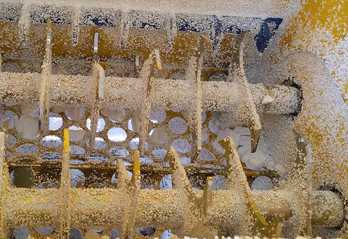 泡沫包裝熱熔機中使用雙軸破碎刀,能將發泡聚苯乙烯物料有效的破碎成較小的物塊,進入篩網。不能進篩網物料進一步破碎,落入篩網,再進入主機經螺桿高速旋轉,將破碎物料輸送到錐形筒體及圓形筒體,經云陶瓷加熱器加熱物料融化,再將熔融物料繼續輸送到成型圓形口模,物料開始降溫,從口模擠出回收物體,根據所需大小尺寸,由切割機自動切斷便完成生產過程。