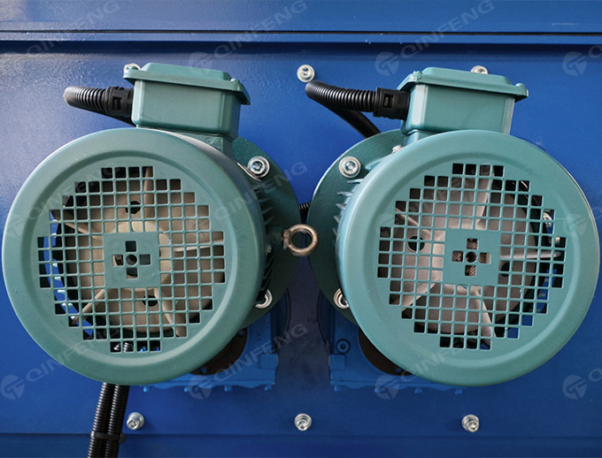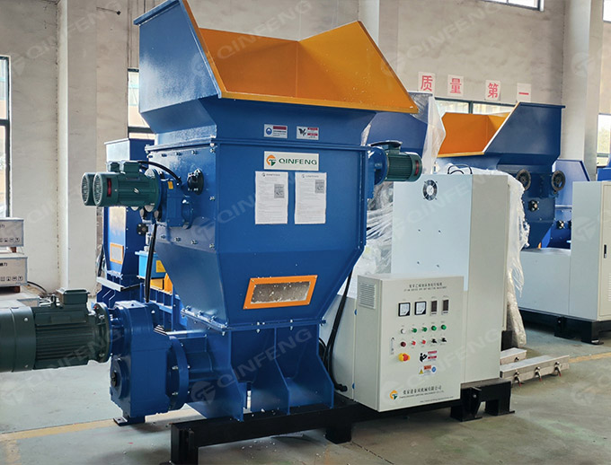 CF-NHM400型號的熱熔機采用四軸破碎刀片、雙排平行的刀片軸對稱地固定在刀片上,刀片在雙軸刀片軸上錯位排列,各軸上的刀片通過計算的方法均勻地布置在同一方向。每一軸上的第一個刀片和最后一個刀片都成90度角。當雙軸破碎刀片開始工作時,兩個平行的刀片軸以不同的旋轉方向進行旋轉,形成一個波浪的控制,這樣材料就可以恒定的速度向下移動,在經過切割刀片的切割后,會變成更小的塊狀。EPS熱熔機里的四軸破碎刀片可以把EPS料變成更小體積的塊,然后通過濾網。這些不能通過濾網再次被破碎的料會最終通過濾網過濾掉。該材料將由高速旋轉螺桿推送到加熱筒。主機的螺桿可以輸送、加熱料,使其達到熱熔狀態,然后擠出并通過模具冷卻得到規則型的方塊,更加便于貯存和運輸。